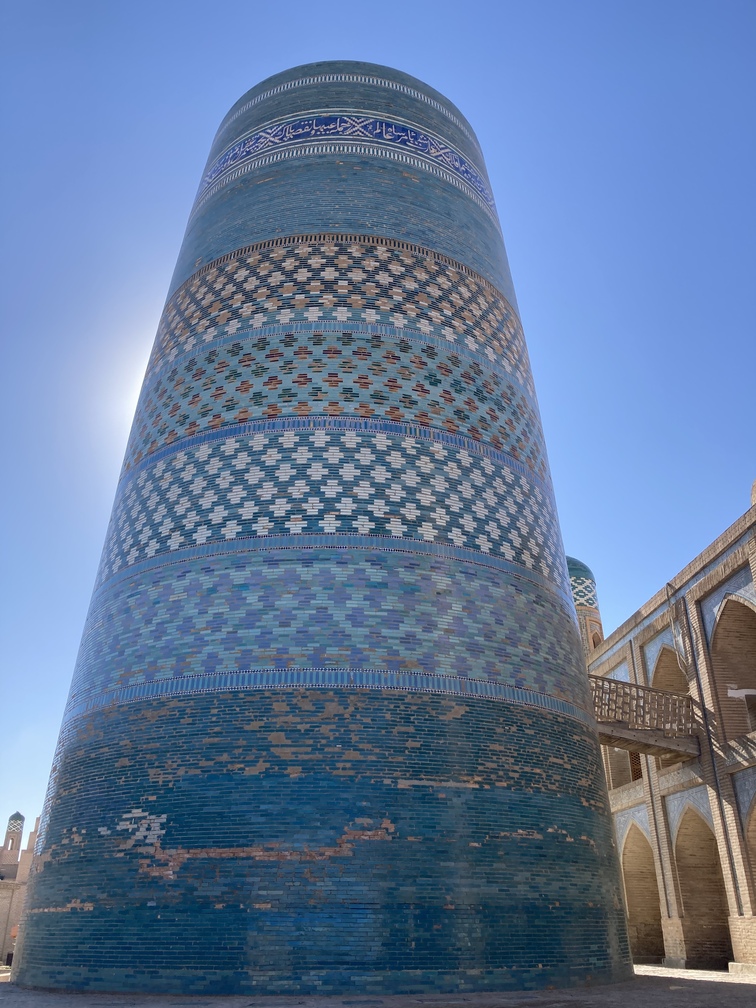 Le lendemain, avec un petit gilet car ici il fait plus frais, nous partons à l’assaut de la ville pour laquelle il faut acheter un ticket à la porte ouest, ce qui donne accès à un certain nombre de sites également pour 120 000 soms/personne pour 2 jours (il faut préciser toutefois que les tickets ne sont contrôlés que sur certaines portes et pas toutes donc vous pouvez toujours entrer dans la ville sans payer). Nous passons devant le Kalta Minaret et nous rendons ensuite au Kuhnaark Palace, site très intéressant qui permet en plus d’avoir une vue en hauteur sur la ville (il faut toutefois privilégier l’après midi où la fin de journée pour les photos). Nous passons ensuite par la Madrasa Shergazi et la mosquée Juma avec ses 218 colonnes en bois.