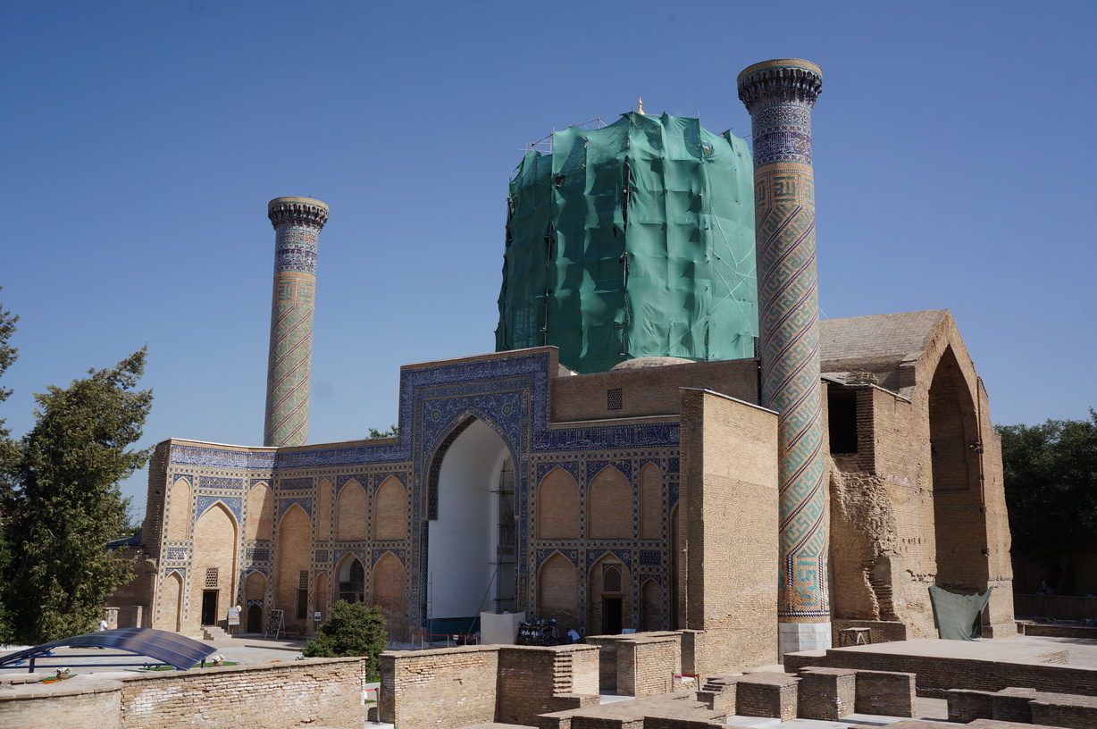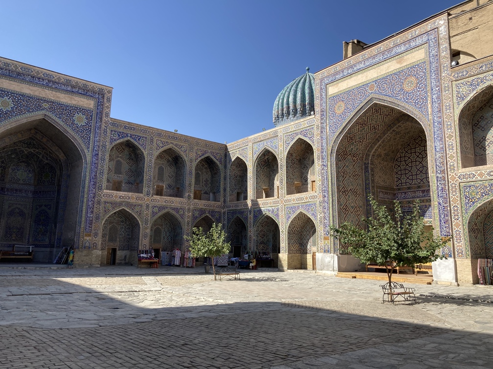 Le lendemain nous partons tôt pour ne pas subit la chaleur qui est quand même écrasante ici en début d’après midi, et nous visitons donc le Registant. Ce dernier est composé de 3 édifices dans lesquels il faut passer un peu de temps : la madrasa Ulug Bek, la madrasa Tillya-Kori et la madrasa Sherdor. Nous partons ensuite visiter la mosquée Bibi Khanyn, puis nous traversons la rue pour nous rendre à la mausolée Bibi Khanyn que nous n’avons pas visité mais qui offre un magnifique point de vue sur la mosquée. Nous passons après au Siab Bazar qui se trouve juste à côté histoire d’acheter de quoi se restaurer. Ce qui est étrange à Samarcande c’est la construction de grands murs qui isolent les sites du reste de la vieille ville et donc des habitants. Nous décidons donc de partir arpenter les ruelles de cette vieille ville charmante avant de rentrer à notre hôtel.